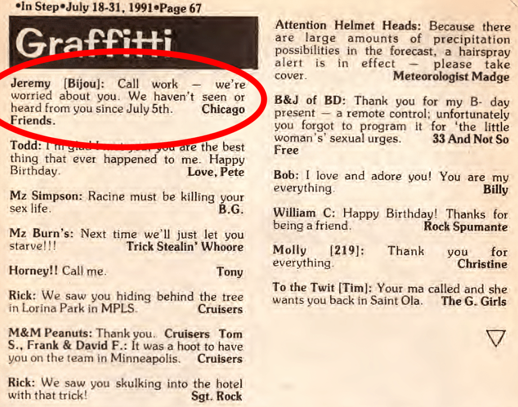 This is an In Step magazine, it is an almanac for all gay activities in Milwaukee (and surroundings). It includes drawings, articles, sex ads and, even, personal ads, which intrigued us so, we decided to cut-out the ads and read them, one by one. It did not take long to find a very curious and gruesome detail, on page 67, in a column of personal ads: