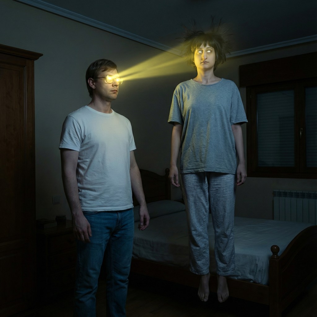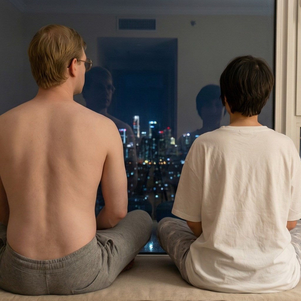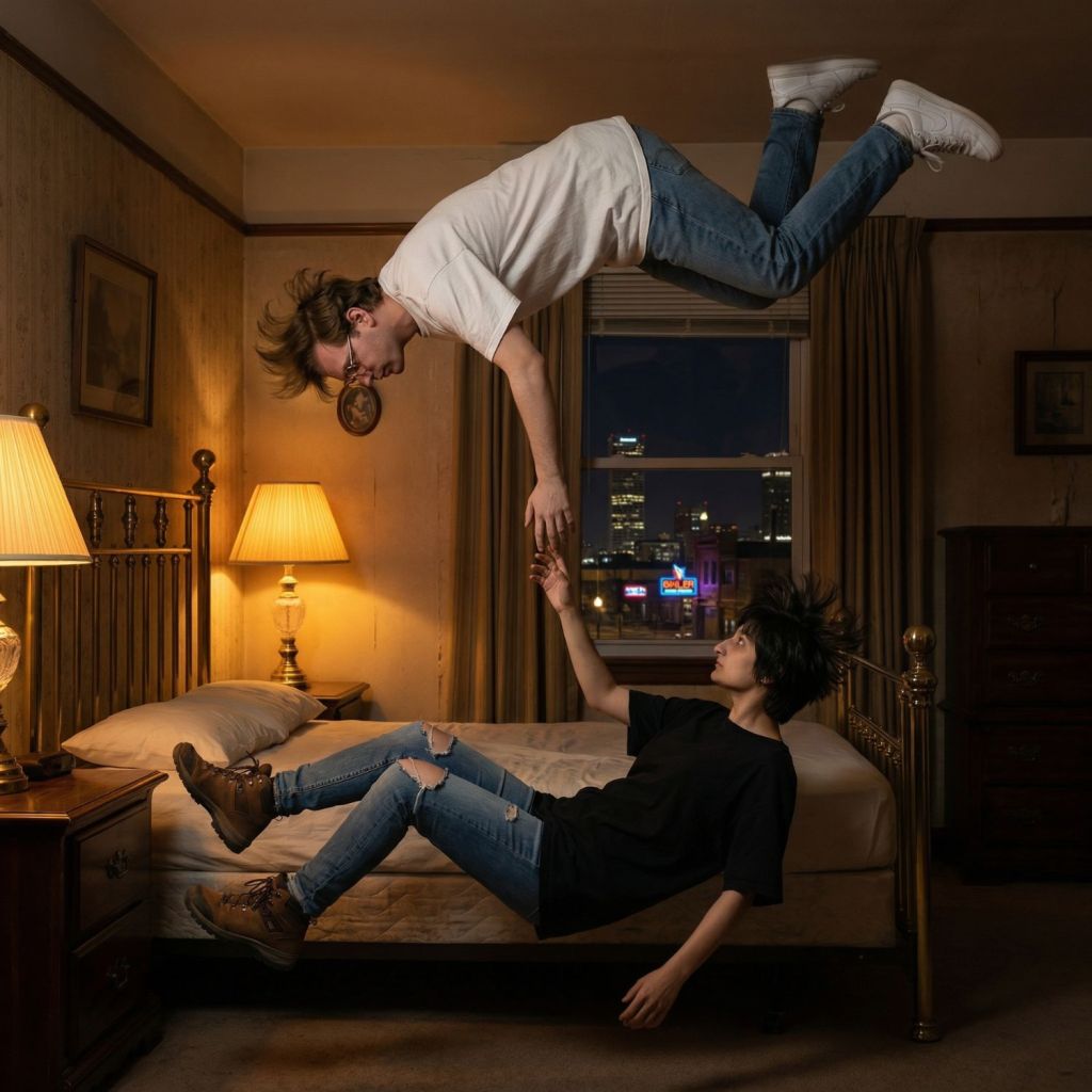 The fourth album, releasing April 18, 2026, is Door213’s most fully realised work yet. Nine tracks. A cover image — two figures floating horizontally in an amber-lit bedroom, one in white above and one in black below, fingers barely touching, Milwaukee glowing through the window behind them — that contains the entire thesis of the album in a single frame.