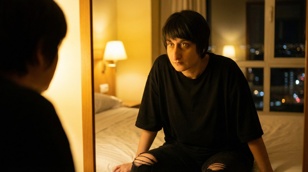 The bedroom with the city night beyond the window would become a recurring motif in Door213’s visual world — and would eventually become the cover of Aftermath itself.