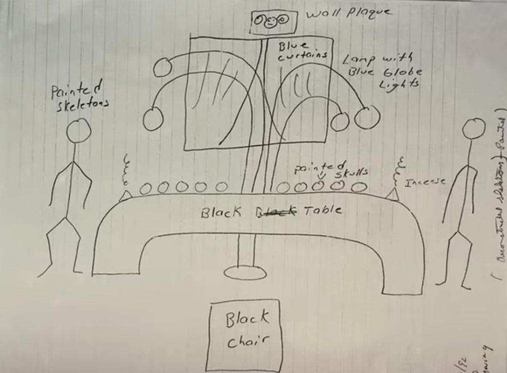 There was a third layer to Jeffrey Dahmer’s visual world — one that existed only in drawings and notes found in the apartment. He had been planning what he called a shrine: a precisely designed aesthetic space, hand-drawn in plans that specified colours and materials. Black carpet. Black plush chair. Windows covered with black shower curtains. A black table. Fluorescent eyes set into a wall plaque. And along the table — painted skulls, arranged in a composition.