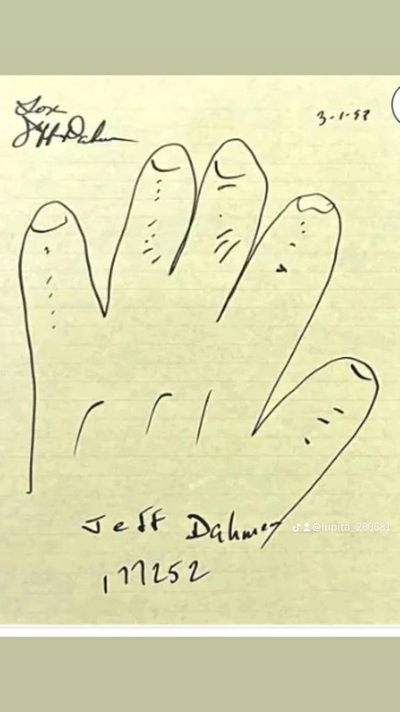 What survives in circulation are small, intimate things. A hand tracing on lined paper, dated March 1, 1993 — his signature above it, J.H. Dahmer, and below the outline of his fingers: Jeff Dahmer. 177252. His name and his number. He placed his hand flat on the paper, traced around it, and sent it to a stranger. There is something almost unbearably human about that gesture — the oldest mark a person can make, the first thing children do with a piece of paper and a pen.