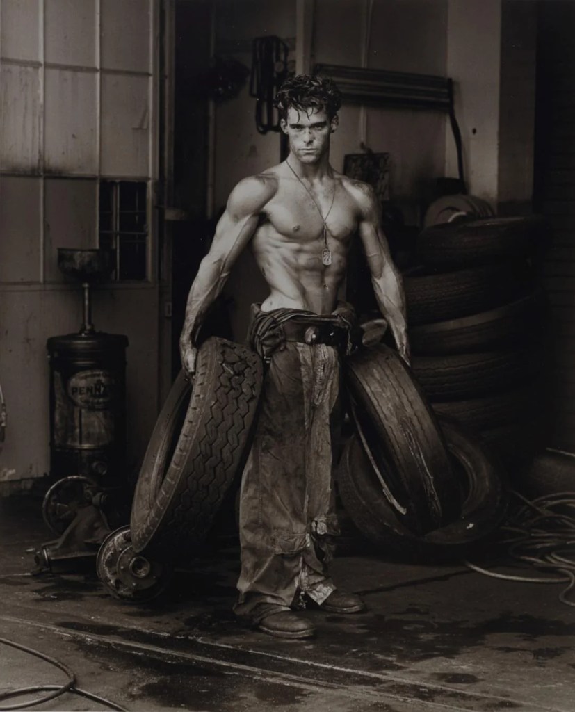 Fred with Tires — Herb Ritts, 1984. One of the most iconic images in twentieth century photography, and the photograph widely credited with launching Ritts’ career. A nude male figure leans against a stack of tyres, the industrial setting in stark contrast with the classical beauty of the body. Ritts — along with Robert Mapplethorpe and Bruce Weber — provoked a radical change in how the nude was depicted in the 1980s.