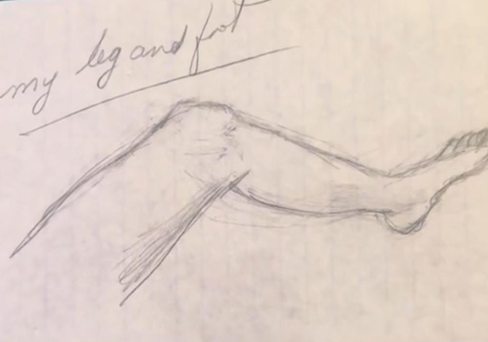 And then there is the sketch labelled in his own handwriting: my leg and foot. A pencil drawing, careful and observational, of his own body. He looked at himself and drew what he saw. Not a fantasy, not an abstraction — just his leg, his foot, rendered with quiet attention.