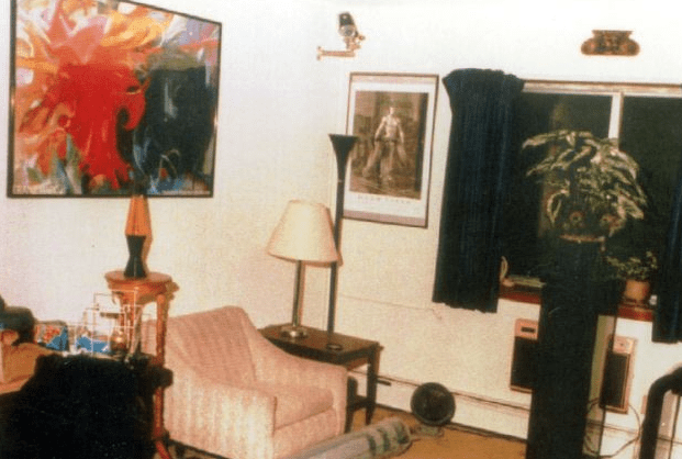 Brian Masters, in The Shrine of Jeffrey Dahmer, describes the living room that Officers Mueller and Rauth first encountered as “small but pleasantly furnished” — an oriental rug, blue curtains, a healthy pot-plant on a tall pedestal, a large comfortable armchair. And then, quietly noted: “some fine pictures on the wall, and one framed picture of a naked male model.”