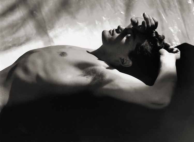 Jean Marais — Raymond Voinquel, 1938. A black and white fine art photograph of French actor and cultural icon Jean Marais, shot by one of France’s foremost portrait photographers. Marais reclines, bare-chested, in dramatic chiaroscuro light — the image has the quality of classical painting, the body rendered with the same reverence one might give to sculpture.