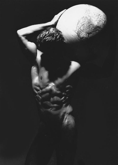 LA Nude — Victor Skrebneski, 1984. Skrebneski was a Chicago-based master of black and white photography known for his classical, sculptural approach to the body. In this image, a nude male figure carries a globe on his shoulders in the pose of Atlas — shot from below, the musculature lit dramatically against deep black. The body as architecture. The body as myth.
